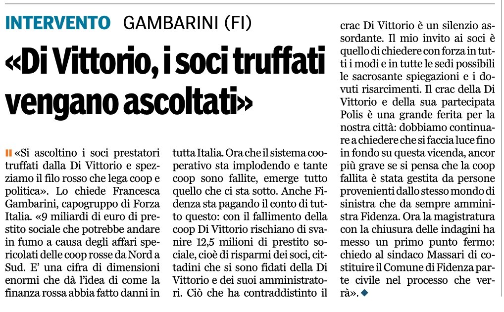 FIDENZA, 19 feb. – “Dopo un lungo periodo di silenzio, arriva oggi un’altra brutta notizia dal fronte coop Di Vittorio. Stando al comunicato diffuso dal comitato dei soci Di Vittorio, Abi Coop ha ufficialmente rinunciato ad acquistare il patrimonio di alloggi della proprietà indivisa della fallita coop Di Vittorio”. Lo scrivono in una nota Giuseppe Comerci, consigliere comunale di “Cambiamo!”, e Francesca Gambarini, componente del comitato nazionale del movimento di Giovanni Toti. “Il movimento cooperativo, quindi, al netto di tutte le belle parole, avrebbe di nuovo voltato le spalle ai soci assegnatori, che ora temono giustamente di vedere a rischio il diritto all’abitazione – proseguono – . Il passaggio della proprietà da una coop all’altra ci aveva sempre lasciato perplessi ma saremmo stati felici di vedere andare in porto l’acquisto. A questo punto, come già detto alcuni anni fa, riteniamo si debbano creare tutte le condizioni per agevolare l’acquisto degli alloggi a prezzi di favore da parte degli assegnatari. Un’altra soluzione, da valutare sul lungo periodo, sarebbe una modifica normativa in modo da consentire la gestione degli alloggi da parte di Acer. Ricordiamo bene che negli anni e nei mesi scorsi la sottoscritta insieme agli consiglieri di opposizione aveva più volta invitato a valutare queste soluzioni ma le nostre mozioni furono sempre bocciate dal sindaco e dal Pd. Ora purtroppo la situazione si fa più grave e riteniamo che il Comune debba mettere in campo tutte le azioni possibili per garantire il diritto all’abitazione agli assegnatari. In attesa che la magistratura porti a termini le indagini sul fallimento, non possiamo non ricordare i legami della Di Vittorio con la sinistra locale, ben sapendo che ci sono responsabilità politiche che vanno ricercate nella filiera Pci/Pds/Ds/Pd, dalla cui scuola vengono tutti gli amministratori delle fallite Di Vittorio e Polis”.